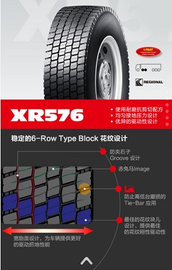 XR576使用耐磨抗剪切配方、均勻接地壓力設(shè)計(jì)以及優(yōu)異的驅(qū)動(dòng)性設(shè)計(jì),寬胎面的設(shè)計(jì)為車(chē)輛提供更好的驅(qū)動(dòng)抓地性能。同時(shí)采用更加穩(wěn)定的6—Row Type Block花紋設(shè)計(jì),包括防夾石子Groove 設(shè)計(jì);赤兔馬Image;防止高低臺(tái)磨損的Tie—Bar應(yīng)用;最佳的花紋塊兒設(shè)計(jì),提供最佳的花紋剛性驅(qū)動(dòng)性。